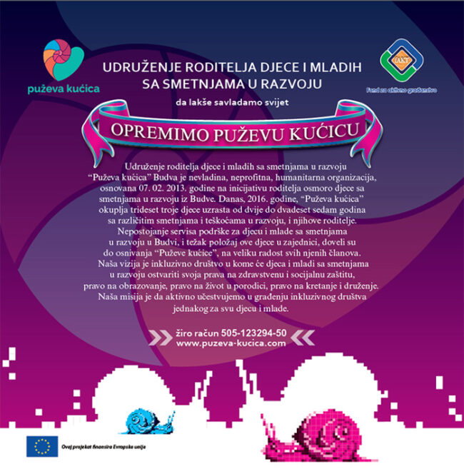 NVO „Puževa kućica“ Budva je od 01.09.2016. godine, započela sa realizacijom projekta „Opremimo puževu kućicu“, koji je podržao Fond za aktivno građanstvo-fAKT, a finansira Evropska unija. U okviru projekta pokrenuli smo akciju prikupljanja sredstava za kupovinu Behringerovog digitalnog logopedskog seta. Akcija je uspješno završena. Sredstva su proteklih mjeseci donirali građani Budve, biznis sektor ,nevladine organizacije…